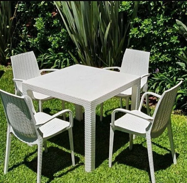 Silla con apoya brazos Melody símil rattan, super resistente y cómoda, gracias a su diseño sencillo y elegante.